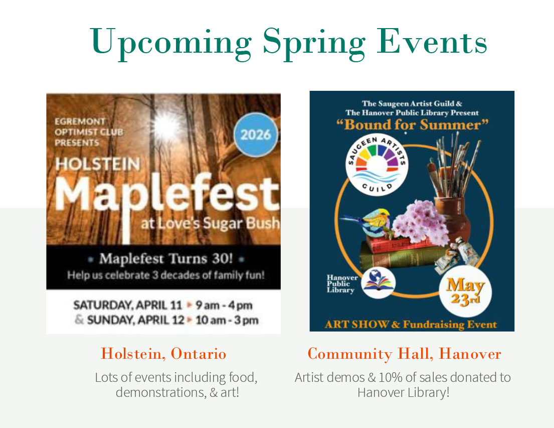 The Saugeen Artists Guild has been an active group of artists in the Saugeen Watershed area since 2008, and a not-for-profit organization since 2018. Our vision is to establish an inclusive environment in the Saugeen Watershed community where people of all diversities can experience and value the arts. Our Artists’ handmade inventory currently includes paintings (watercolour, acrylic, oil, and pastel), jewelry, pottery, glass and woodworking. Be sure to check out the Artists section on the web to view their work. Be sure to visit the web site frequently to keep informed of our shows and events in Hanover and other locations. The highlight of the year is always the Christmas Gift Shop, which operates in a rented retail area for November and December, and has become a sought-after destination to purchase gifts during the holiday season. The Guild organizes a weekly Open Art Studio at St. Matthew's Lutheran in Hanover. We invite anyone interested to join us and bring their art projects for inspiration and social time.