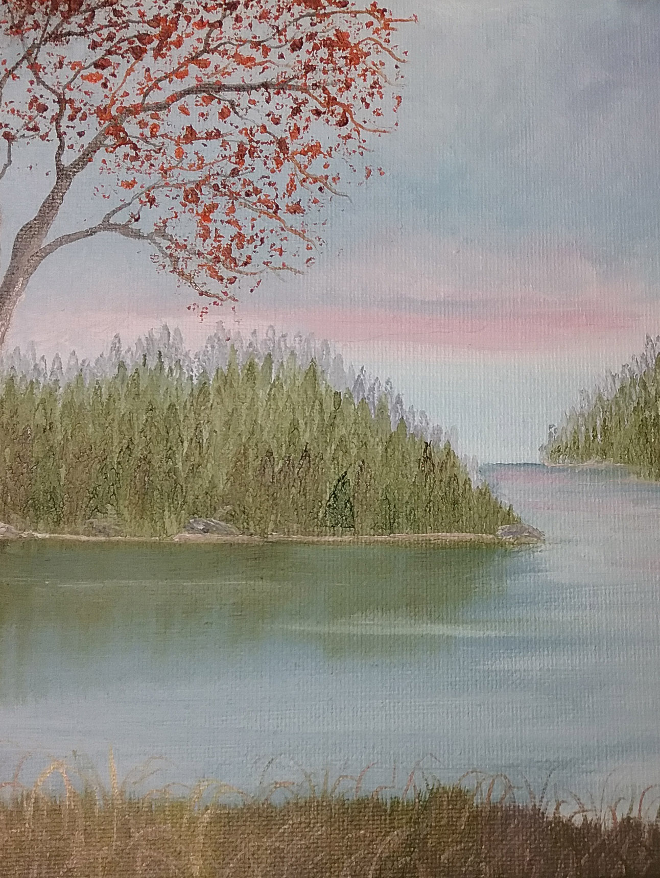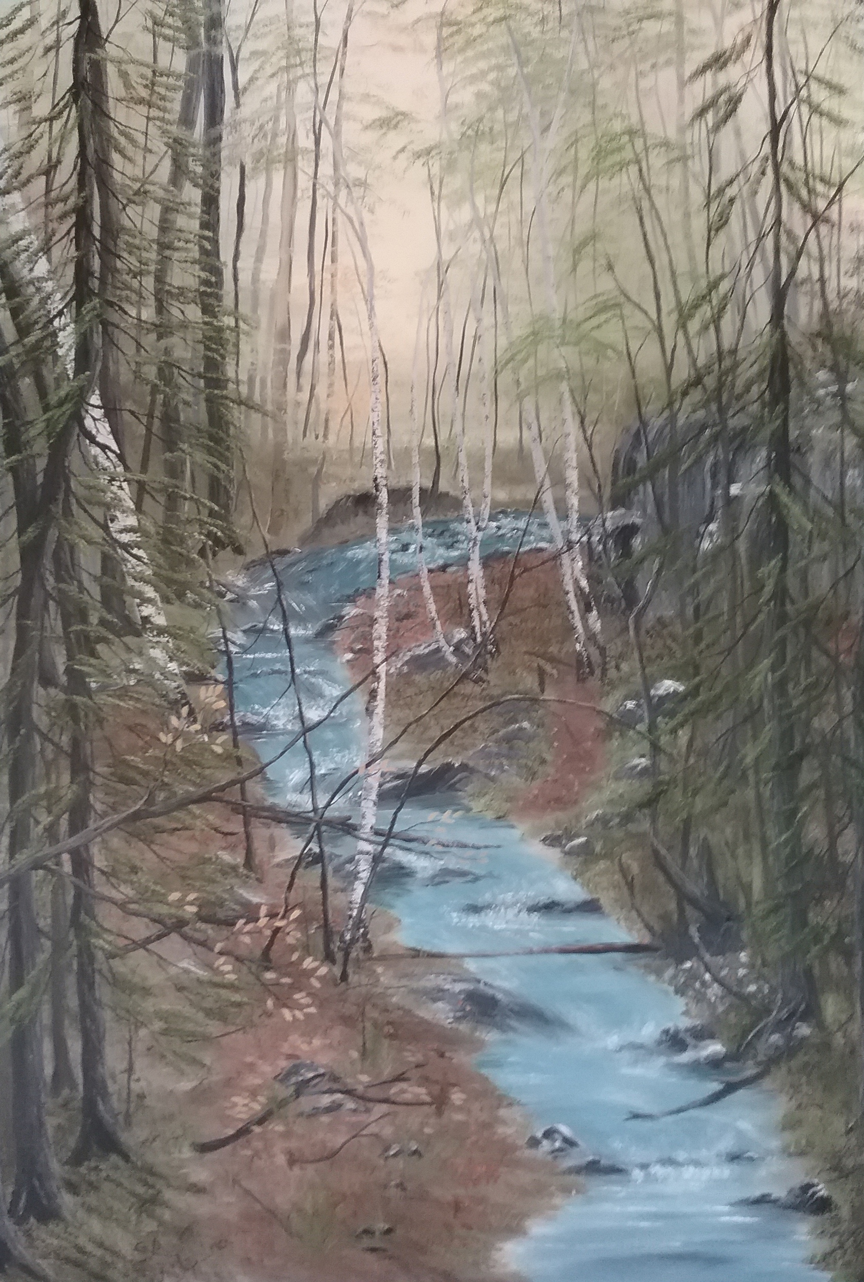 When walking in the bush, along the lake, kayaking, or just looking at the landscape when driving, I am truly amazing at the wonder of God’s creation and at my attempt to show the majesty on canvas. The shadows are what I try to recreate to contrast shadows and sun. The colors of the sunset and the luminescence cannot be truly captured on canvas but will bring to mind all the beauty that we can enjoy.